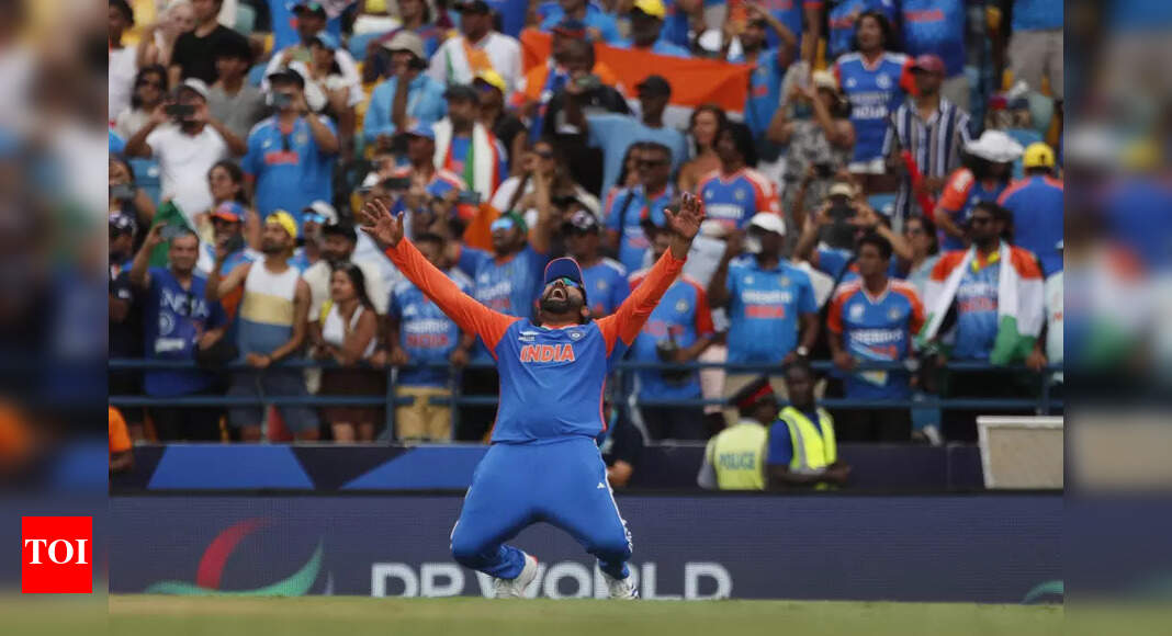 Rohit Sharma of India celebrate his team’s win over South Africa during the ICC Men’s T20 World Cup final match…