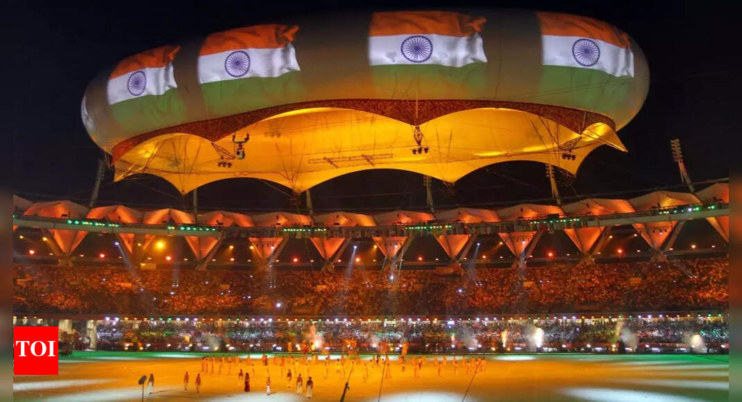 The Indian national flag is projected onto a balloon during the 2010 Commonwealth Games closing ceremony at the Jawaharlal Nehru…