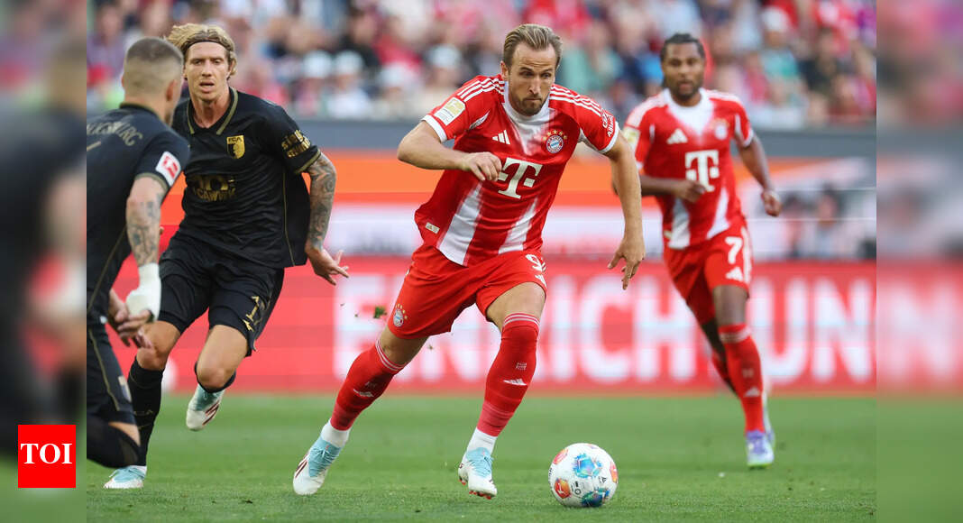 Harry Kane of Bayern Munich runs with the ball during the Bundesliga match between FC Augsburg and FC Bayern München…