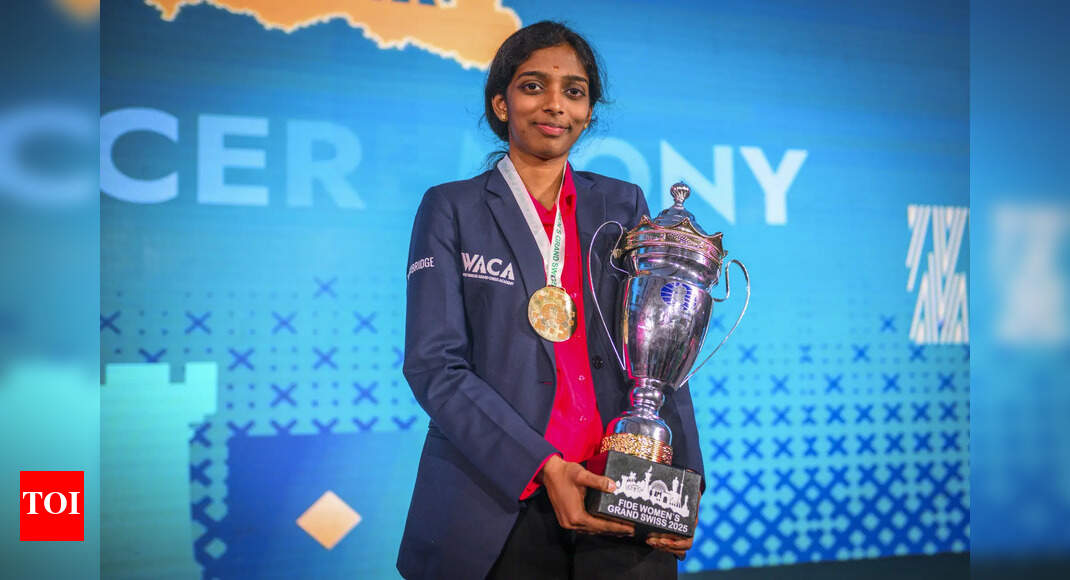 India’s GM Vaishali Rameshbabu poses with her trophy after winning the FIDE Women’s Grand Swiss 2025 in Samarkand, Uzbekistan. (FIDE/PTI)…