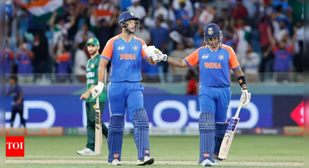India’s captain Suryakumar Yadav and batting partner Shivam Dube leave the field after their win against Pakistan (AP/PTI) Dubai: India…