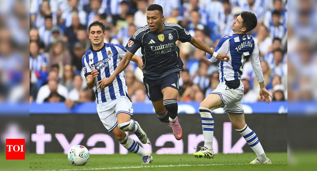 Real Madrid’s Kylian Mbappe, in action between Real Sociedad’s Jon Gorrotxategi and Igor Zubeldia (AP Photo/Miguel Oses) Real Madrid secured…