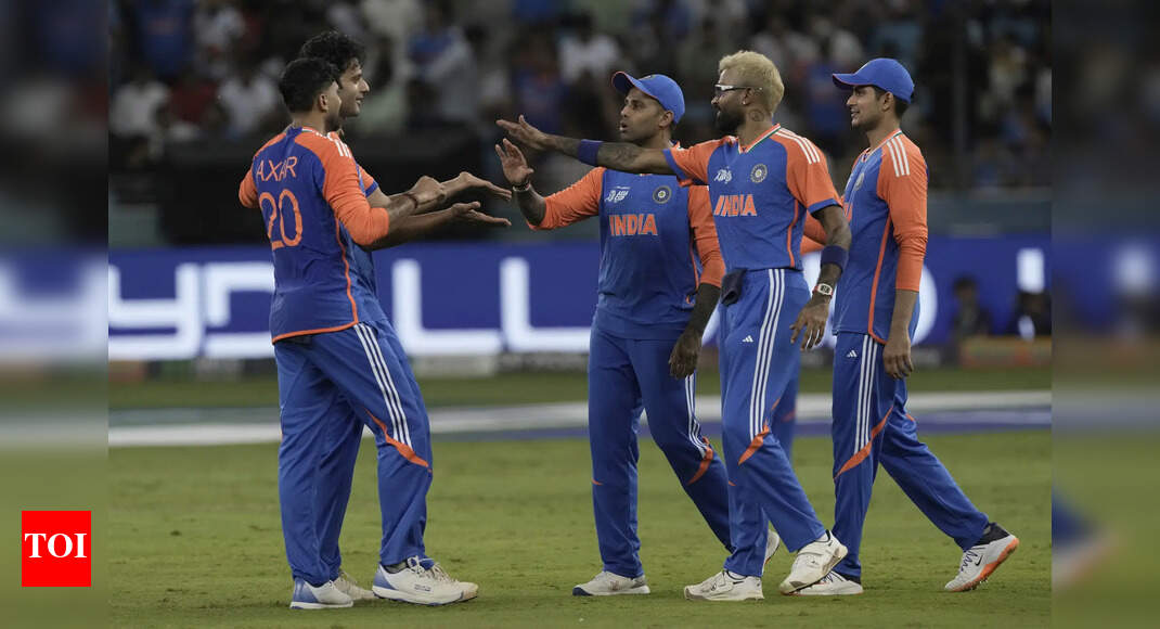 India’s Shivam Dube celebrates with teammates after the dismissal of UAE’s Junaid Siddique (AP Photo/Fatima Shbair) For the first time…