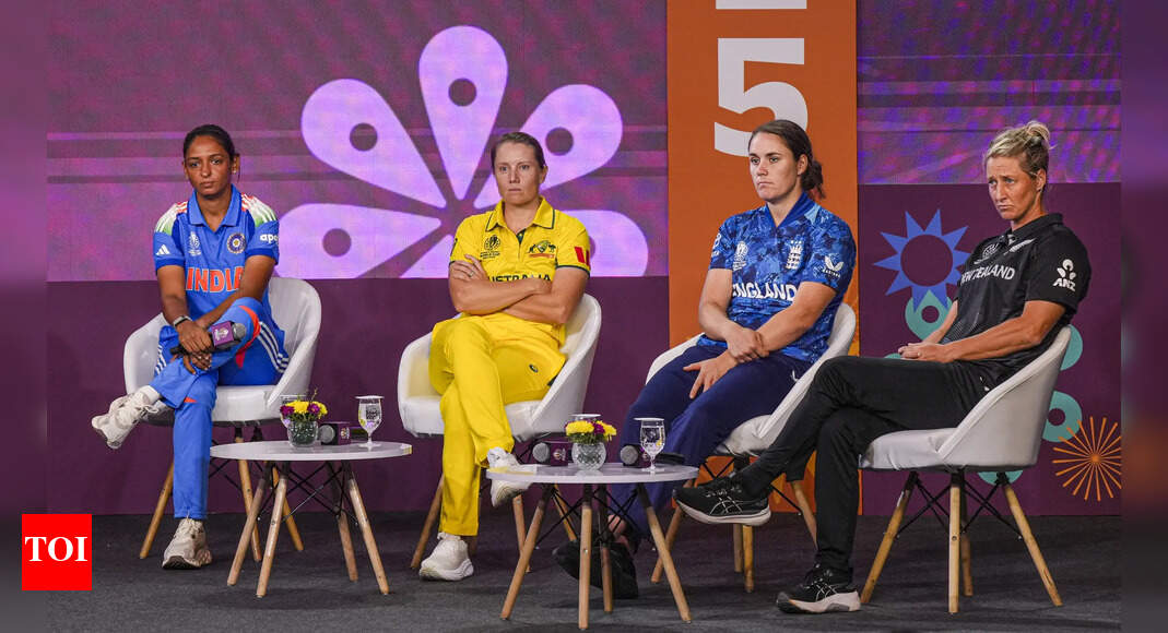 India’s captain Harmanpreet Kaur, Australia’s captain Alyssa Healy, England’s captain Nat Sciver-Brunt and New Zealand’s captain Sophie Devine (PTI Photo/Shailendra…