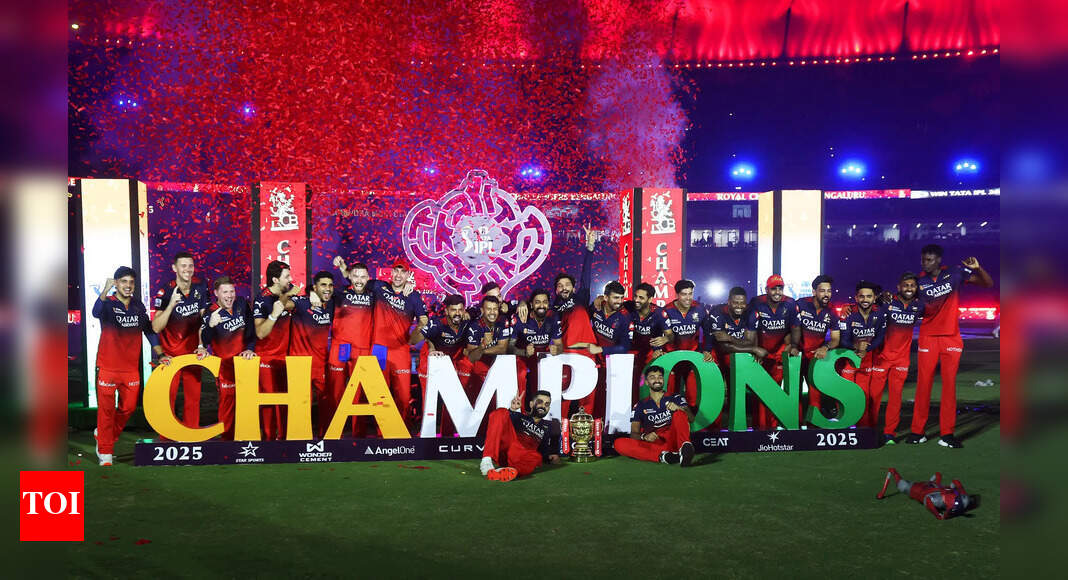 AHMEDABAD, INDIA – JUNE 03: Virat Kohli and Devdutt Padikkal of Royal Challengers Bengaluru celebrate next to the IPL trophy…