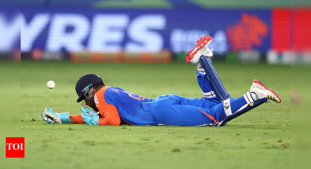 Sanju Samson of India drops a catch during the Asia Cup match between India and Bangladesh at Dubai International Stadium.…
