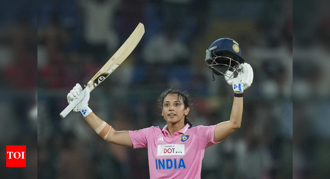 Smriti Mandhana celebrates her century during the third ODI cricket match of a series between India Women and Australia Women,…