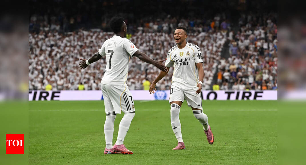Kylian Mbappe of Real Madrid (R) celebrates scoring his team’s second goal with teammate Vinicius Junior during the LaLiga EA…