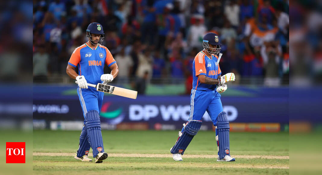 Shivam Dube (L) and Suryakumar Yadav (R) of India leaves the field after the Asia Cup match between India and…
