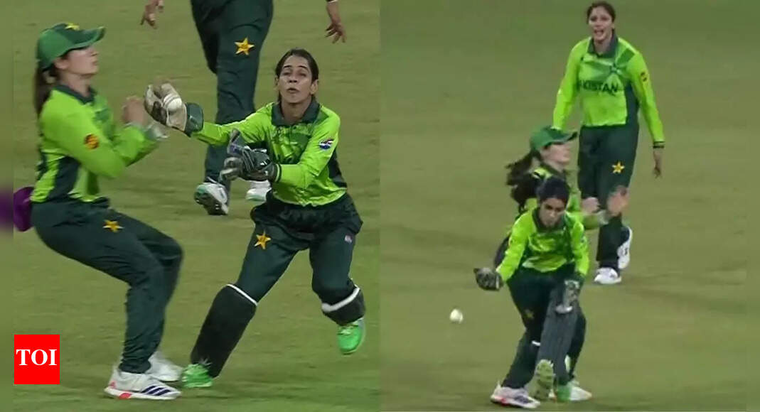A comical coordination error resulted in a dropped catch towards the end of India’s innings (Screengrabs) The ICC Women’s World…