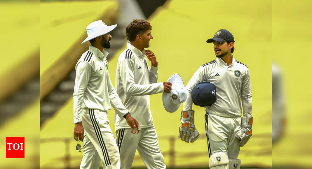 Nagpur: Rest of India’s Ruturaj Gaikwad, left, Ishan Kishan, right, and others return to pavilion due to low light on…