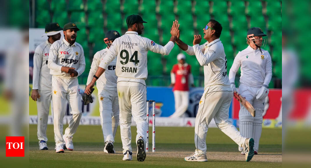 Pakistan’s Noman Ali, second right, celebrates with teammates after taking the wicket of South Africa’s Kyle Verreynne, right, during the…