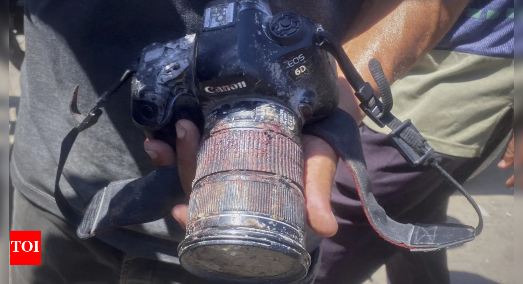 In this family handout photo, a person shows the blood-stained camera that freelance journalist Mariam Dagga, 33, was carrying when…