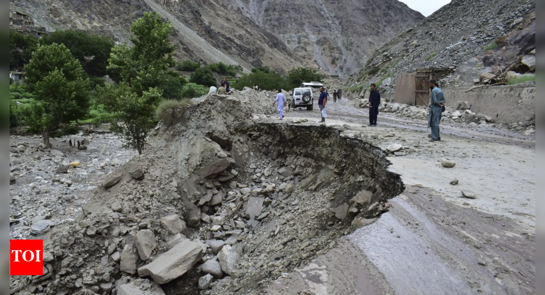 File photo of Pakistani local residents walking on a damaged road following a cloudburst-triggered landslide and flash flood on a…