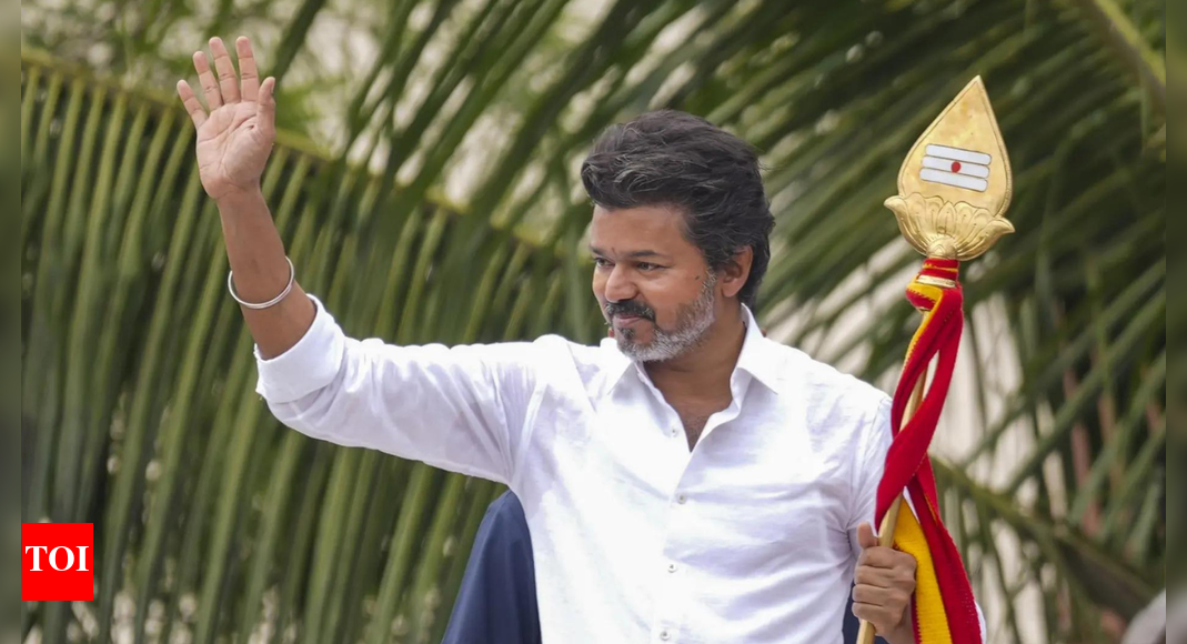 Actor and Tamilaga Vettri Kazhagam (TVK) founder Vijay greets people during a public rally, in Nagapattinam district, Tamil Nadu. (PTI…