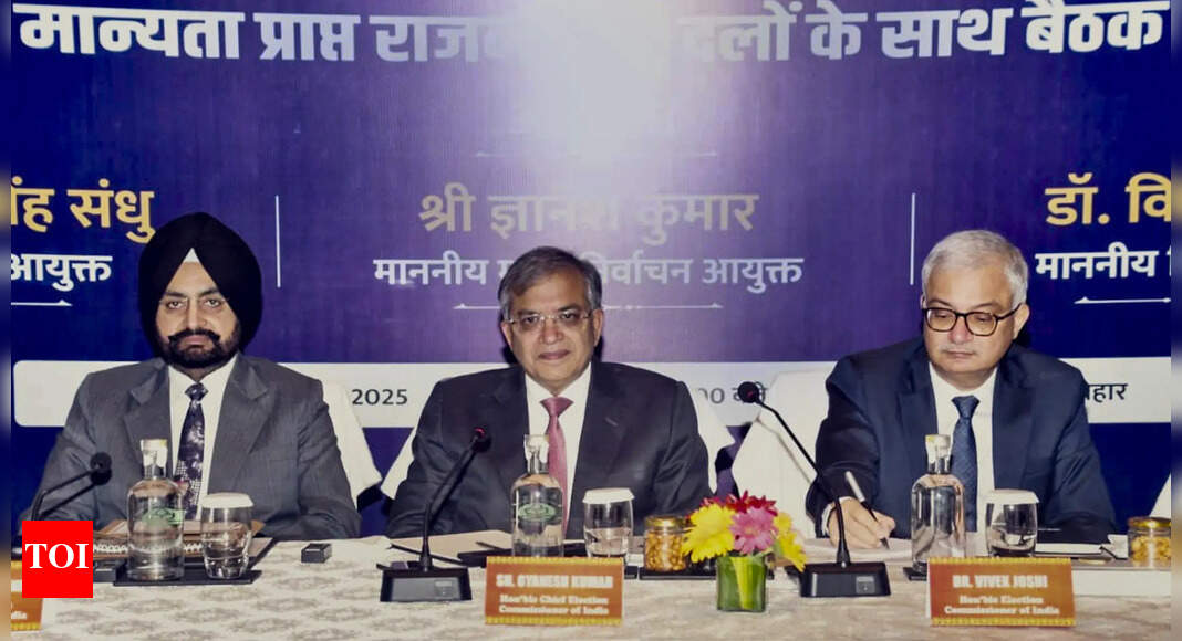 Chief election commissioner Gyanesh Kumar (centre) with election commissioners Sukhbir Singh Sandhu and Vivek Joshi during a meeting with all…