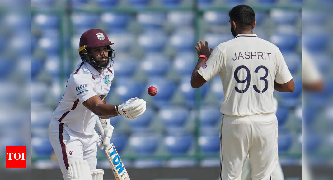 West Indies’ John Campbell gives the ball to Jasprit Bumrah during the fourth day of the second Test at the…