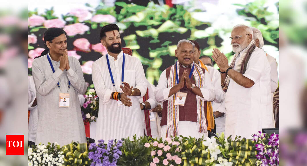 Prime Minister Narendra Modi, Union Ministers Jitan Ram Manjhi (2nd from right) and Chirag Paswan (2nd from left). (PTI Photo)…