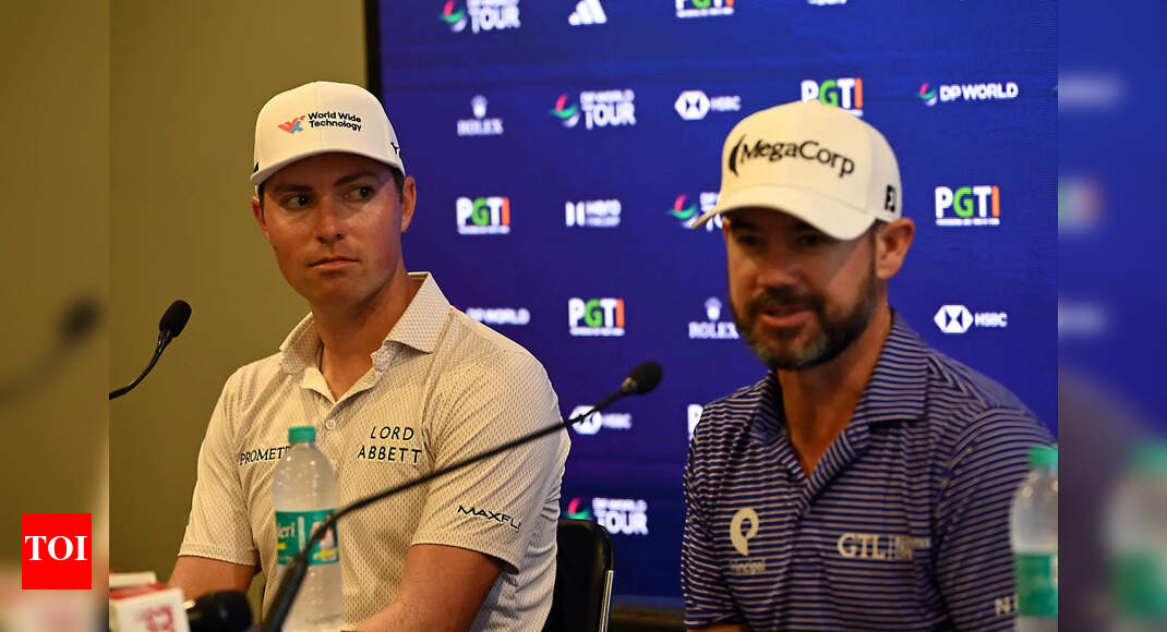 Ben Griffin (L) and Brian Harman address a press conference prior to the DP World India Championship 2025 (Photo by…