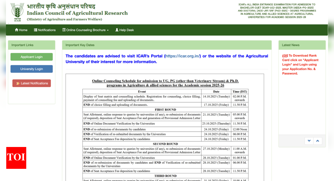 भारतीय कृषि अनुसंधान परिषद (ICAR) आज, 14 अक्टूबर, 2025 को दोपहर 2 बजे से ICAR अंडरग्रेजुएट (UG) काउंसलिंग 2025 के…