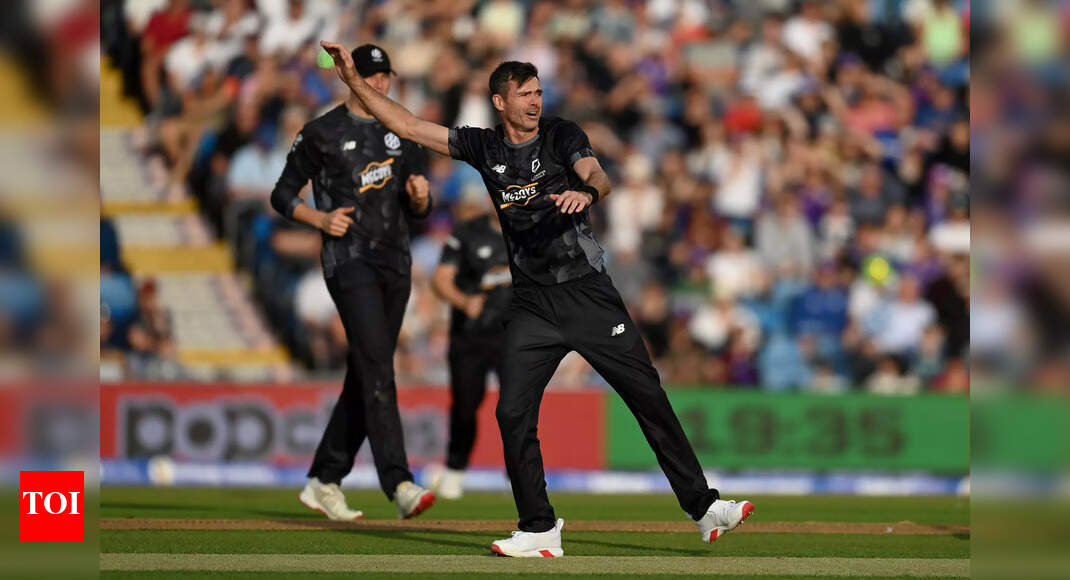 James Anderson of Manchester Originals celebrates dismissing Dan Lawrence of Northern Superchargers during the The Hundred match between Northern Superchargers…
