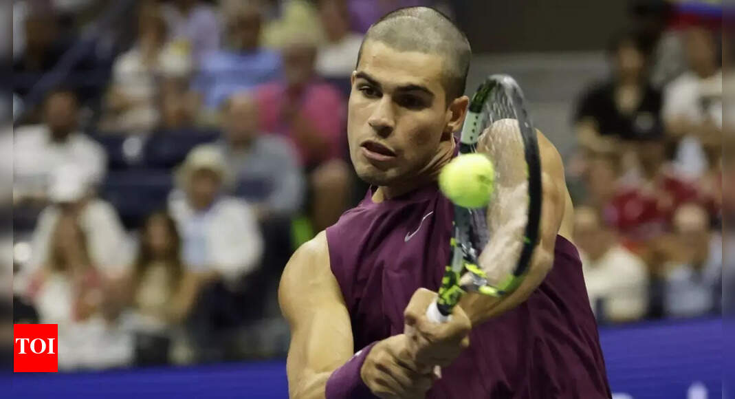 Carlos Alcaraz returns the ball to Reilly Opelka during his first round match at the 2025 US Open. (AP) What…